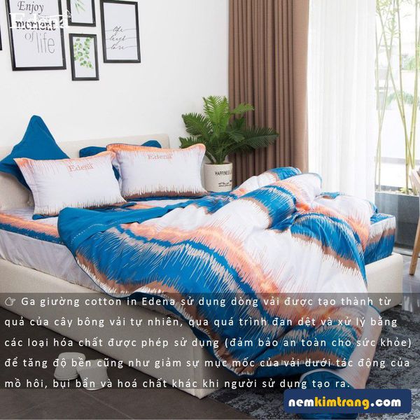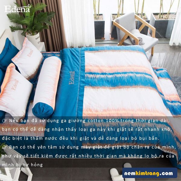 Ga giường cotton in Edena sử dụng dòng vải được tạo thành từ quả của cây bông vải tự nhiên, qua quá trình đan dệt và xử lý bằng các loại hóa chất được phép sử dụng (đảm bảo an toàn cho sức khỏe) để tăng độ bền cũng như giảm sự mục mốc của vải dưới tác động của mồ hôi, bụi bẩn và hoá chất khác khi người sử dụng tạo ra.