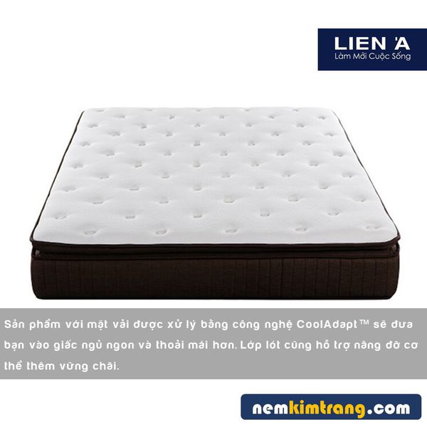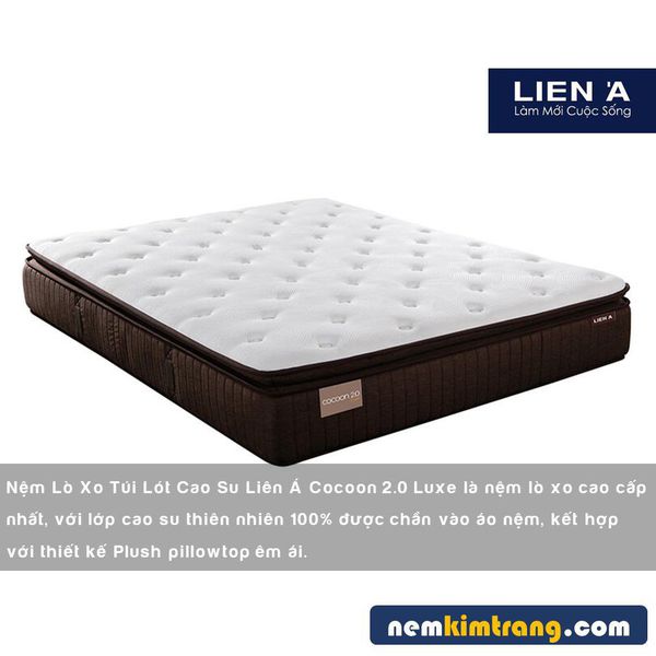 👉 Nệm Lò Xo Túi Lót Cao Su Liên Á Cocoon 2.0 Luxe là nệm lò xo cao cấp nhất, với lớp cao su thiên nhiên 100% được chần vào áo nệm, kết hợp với thiết kế Plush pillowtop êm ái. Sản phẩm với mặt vải được xử lý bằng công nghệ CoolAdapt™ sẽ đưa bạn vào giấc ngủ ngon và thoải mái hơn. Lớp lót cũng hỗ trợ nâng đỡ cơ thể thêm vững chãi. Hệ thống lò xo túi độc lập hấp thụ từng chuyển động nhỏ nhất của bạn, khiến cho giấc ngủ thêm ngon và sâu giấc.
