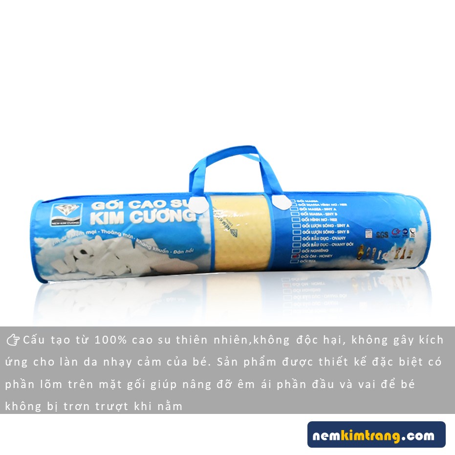 Gối ôm cao su Honey Kim Cương (nhiều kích thước) 100% CHÍNH HÃNG?? Chất liệu: Cao su thiên nhiên 100%?? Gối ôm cao su Kim Cương có độ cứng đồng đều do được đúc nguyên khuôn, mang lại cảm giác êm ái và mềm mại khi ôm vào lòng.?? Thoáng mát với hệ thống lỗ thông hơi nằm khắp mặt gối?? Thiết kế hình dáng đặc biệt giúp gối không bị trơn trượt khi ôm, cho bạn giấc ngủ ngon hơn.?? Xuất xứ: Việt Nam?? Thương hiệu: Kim Cương?? Đặc điểm ?? Gối ôm cao su Kim Cương có độ cứng đồng đều do được đúc nguyên khuôn, mang lại cảm giác êm ái và mềm mại khi ôm vào lòng. Gối thoáng mát với các lỗ thông hơi trải đều khắp mặt gối. ?? Thiết kế hình dáng đặc biệt giúp gối không bị trơn trượt khi ôm, cho bạn giấc ngủ ngon hơn.?? Sản phẩm có độ đàn hồi tối ưu - độ bền & tuổi thọ cao đạt các chứng nhận quốc tế danh giá vềchất lượng.??Sản phẩm được làm từ các chất liệu sạch khuẩn, kháng khuẩn, không côn trùng lưu trú, thânthiện với môi trường.?? Quyền lợi khách hàng?? Shop bảo đảm chất lượng sản phẩm và cam kết đổi trả khi sản phẩm kém chất lượng và không giống hình, nhầm size, nhầm số lượng. Sản phẩm đổi trả phải còn nguyên mác, túi đựng và chưa được sử dụng.?? Đối với khách hàng cũ, bạn hãy nhắn tin với shop ngay để được ưu đãi nha!?? Cam kết của shop Kim Trang với sản phẩm?? Shop Kim Trang bảo đảm ảnh sản phẩm là ảnh thật, hàng thật của sản phẩm, bảo đảm chất lượng tốt nhất cho khách hàng.?? Giá sản phẩm cam kết tốt nhất thị trường (có thể so sánh), phù hợp túi tiền mọi khách hàng.